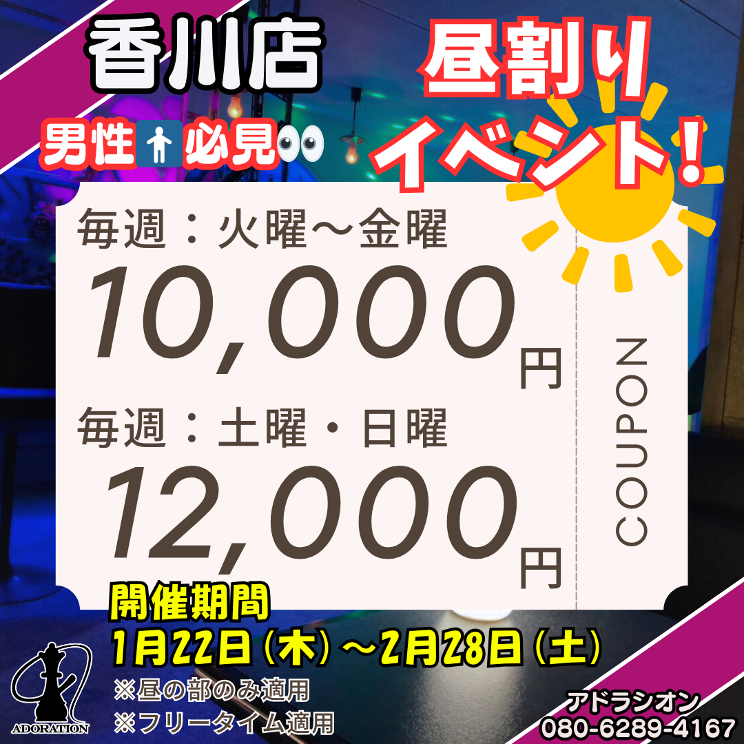🌞✨香川店✨🌞 割り引きイベント開催‼️ \👀男性必見👀/ 通常15,000円のところを… 💰平日(火曜〜金曜) ⇒10,000円‼ 💰土曜・日曜 ⇒12,000円‼ 📅開催期間:1/22(木)〜2/28(土) 最大5000円も安くなるチャンスっ🔥✨ 見逃し厳禁です👀🔥!! ※詳細は画像を参照ください🥰 お問い合わせは公式SNSのDM、またはお電話まで☎💙